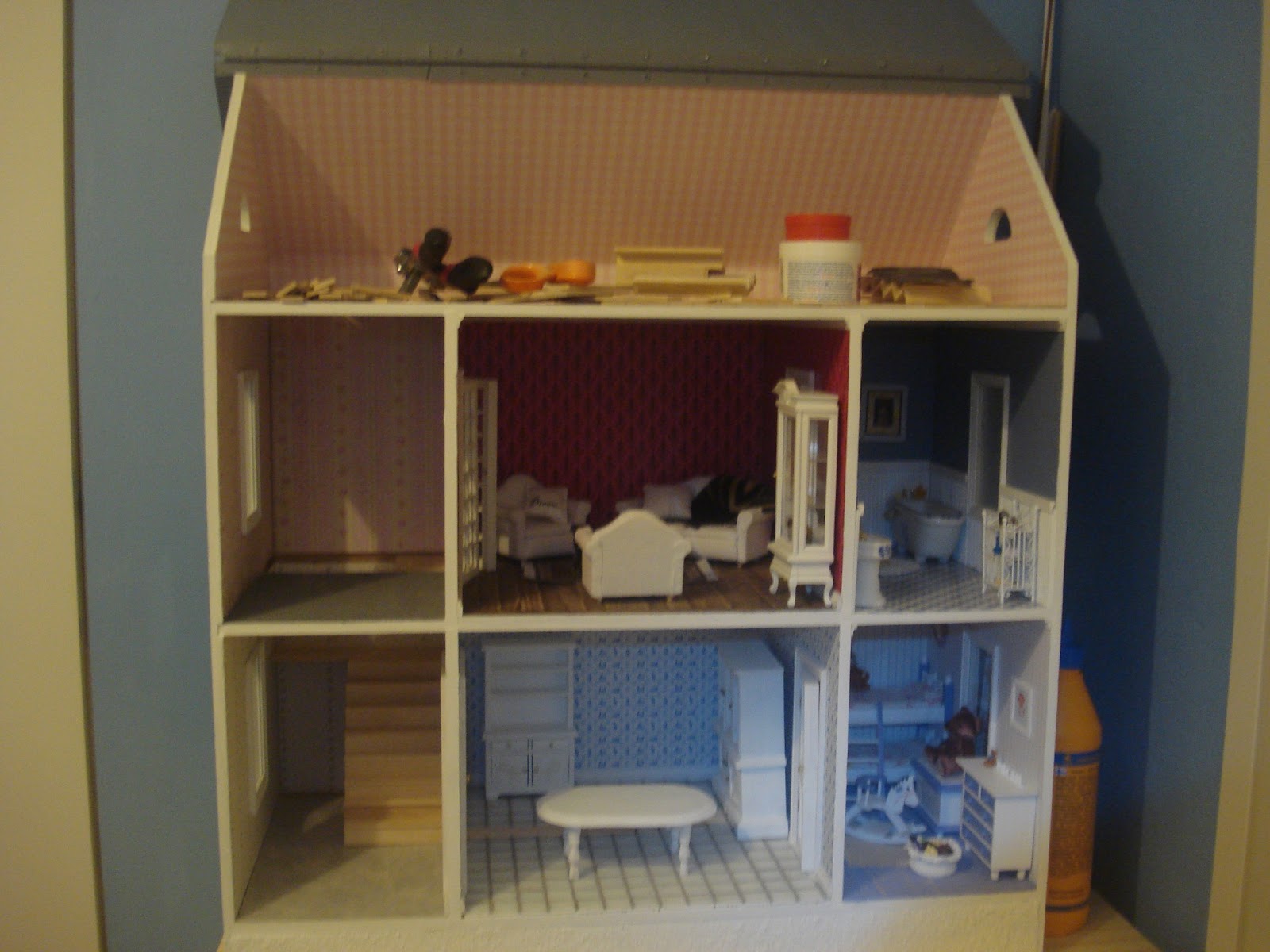 Olkkarissa kakki huonekalut on ostotavaraa, lahjaksi saatuja ja itse ostettuja. Sohvan ja nojatuolit aion päällystää uudelleen jonain päivänä. Ne ostin hong kongista, oli puoleen hintaan joulun alla. Kivan malliset mutta tosi huonosti päälystetty. Lattia on bilteman tikkua, vahasin sen ruskealla puuvahalla ja hioin. Tapetit ostin nukkekotikaupasta ja lasipariovet olen itse tehnyt pleksistä ja rimasta.